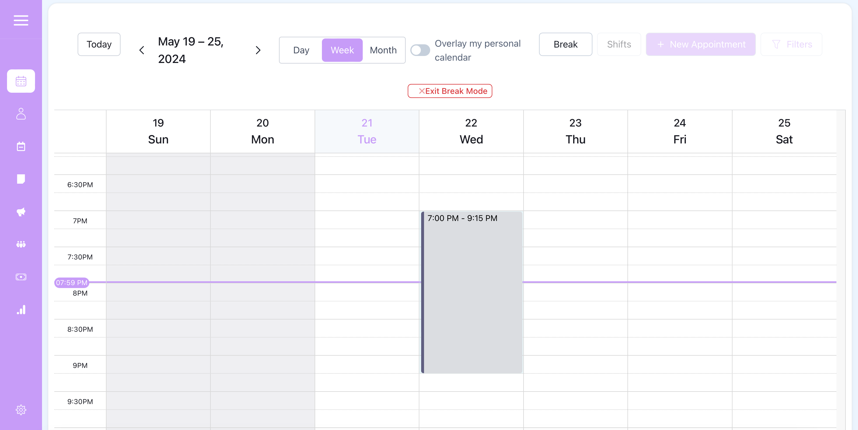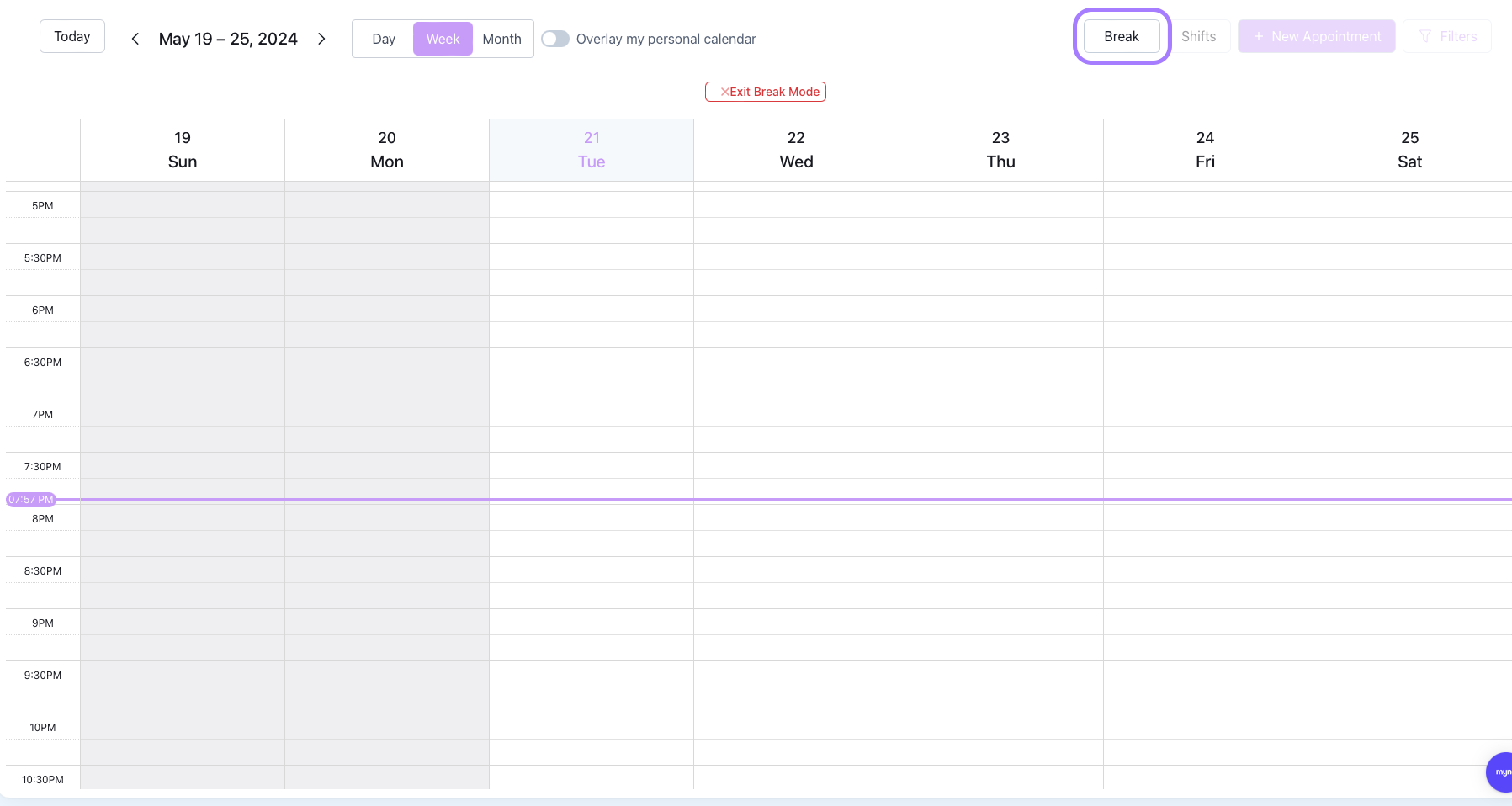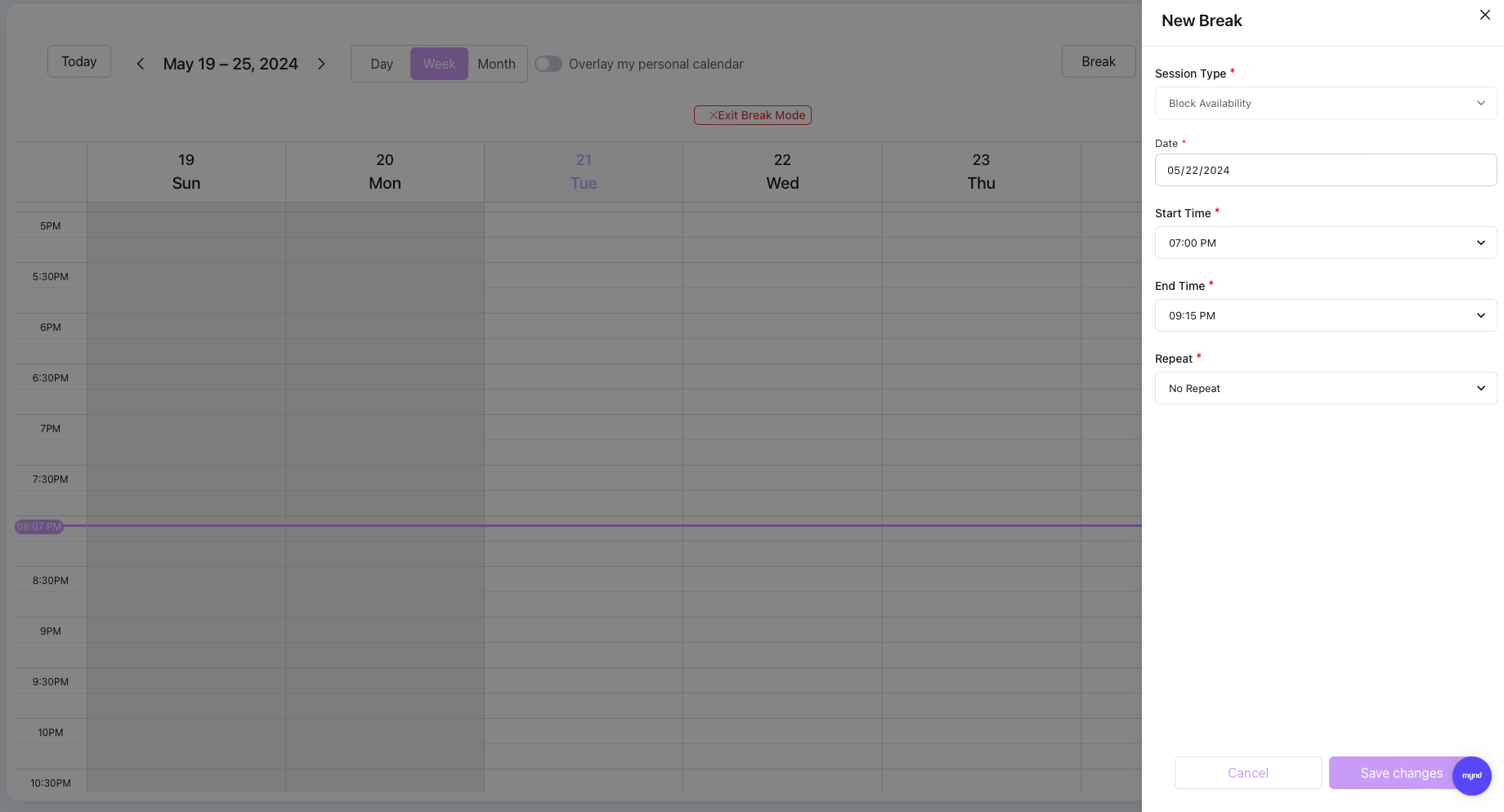 Breaks are an easy way to block off time on your calendar to ensure you do not accidentally schedule a session when you are not available and to block off the online booking calendar so clients can not book appointments themselves during that block.