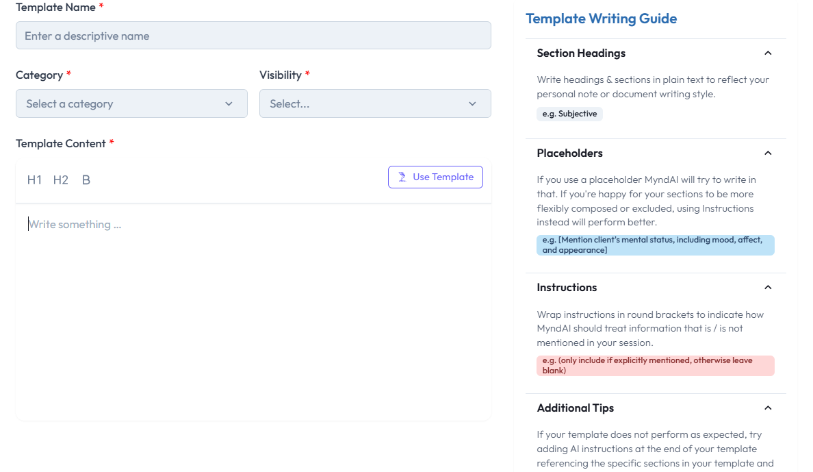 Using Placeholders: Use placeholders (indicated in blue within square brackets) to dynamically insert information such as client name, session date, and specific client concerns. These placeholders will automatically be filled in by the AI based on the session content.