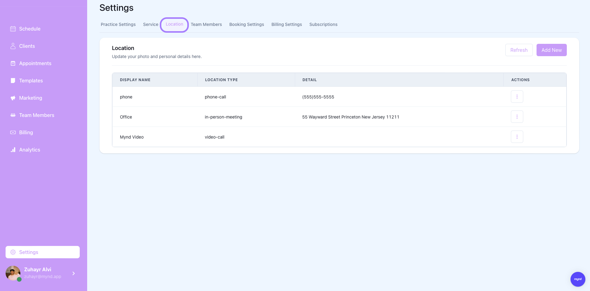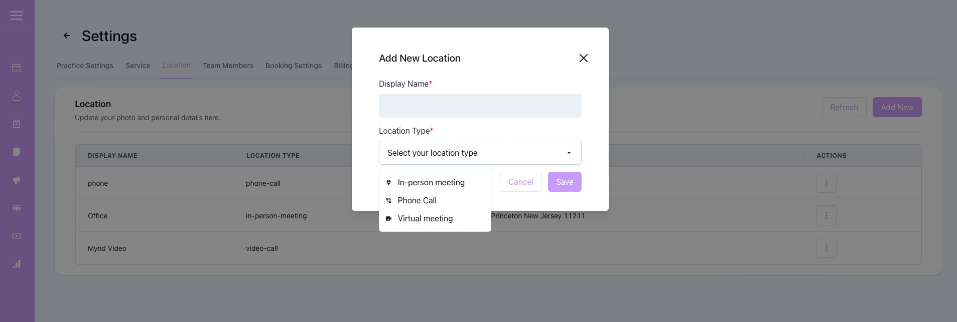 By clicking add new, you can create new locations to your practice on Mynd. Display name's are used for referencing the location throughout the platform.