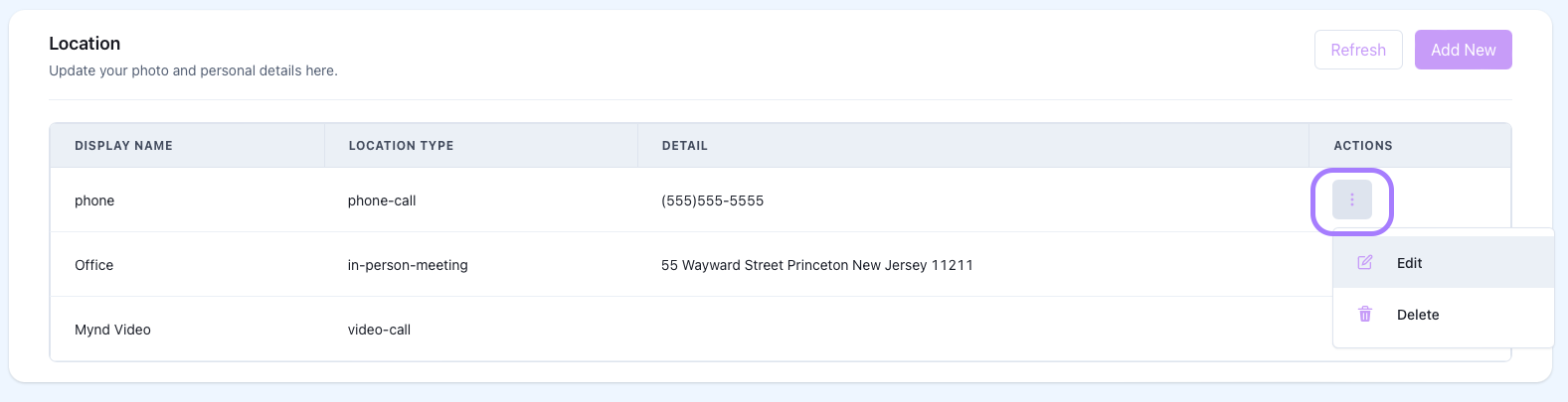 Clicking the three dots on the side of an existing location shows the menu to either delete or edit the location information.