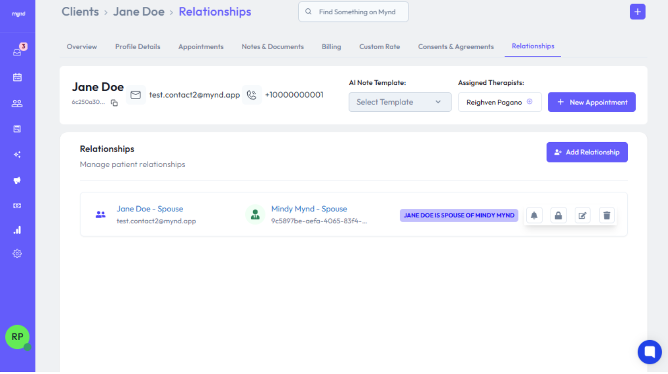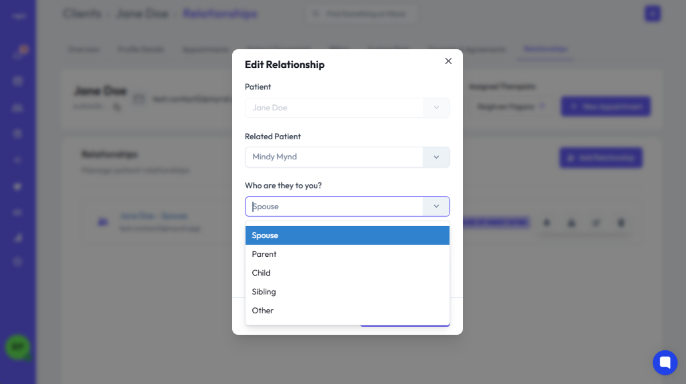 This guide explains how to view, add, and remove relationships between clients within the Mynd platform. Defining relationships helps organize client connections and streamlines features like group booking.