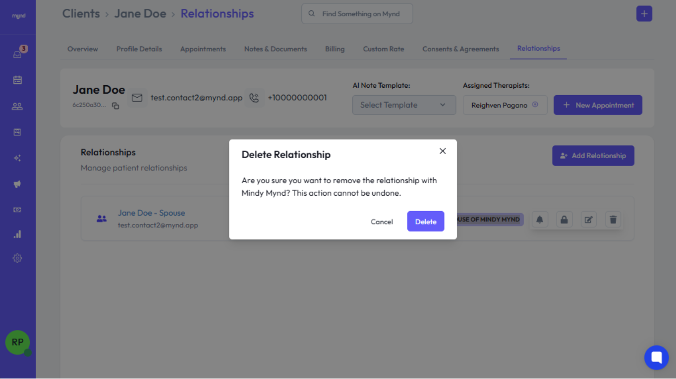 Confirm: A confirmation prompt will appear (e.g., "Are you sure you want to remove the relationship with [Client Name]?"). Click Delete.